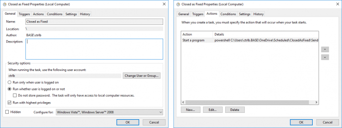 Next is the PowerShell window that pops up for a millisecond when tasks are running. You can avoid this by selecting “Run whether the user is logged in or not” but this requires Administrator access.