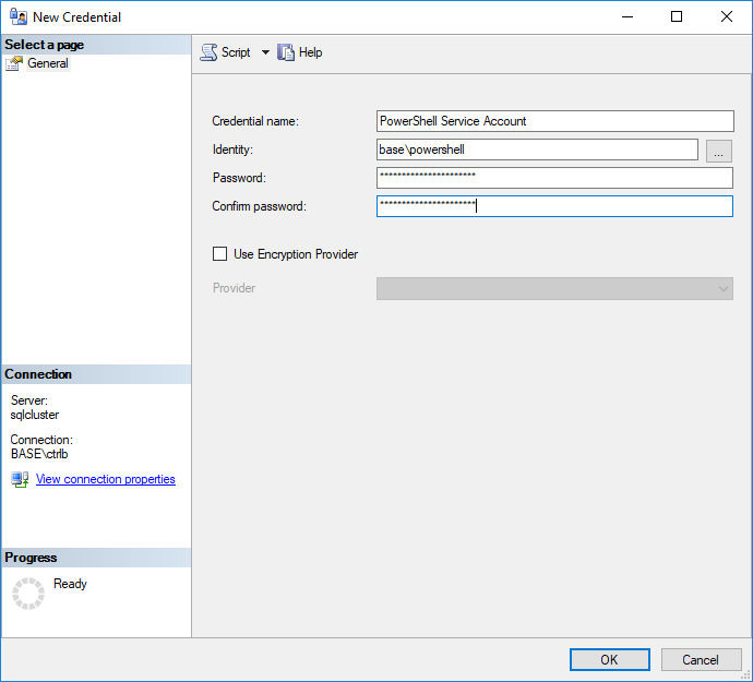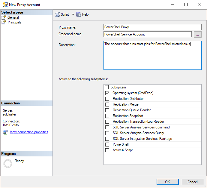 While the SQL Server Agent service account could be used across the board, it’s better to use a distinct credential for my PowerShell tasks. This enables the granting of specific permissions to the account, as they are required.