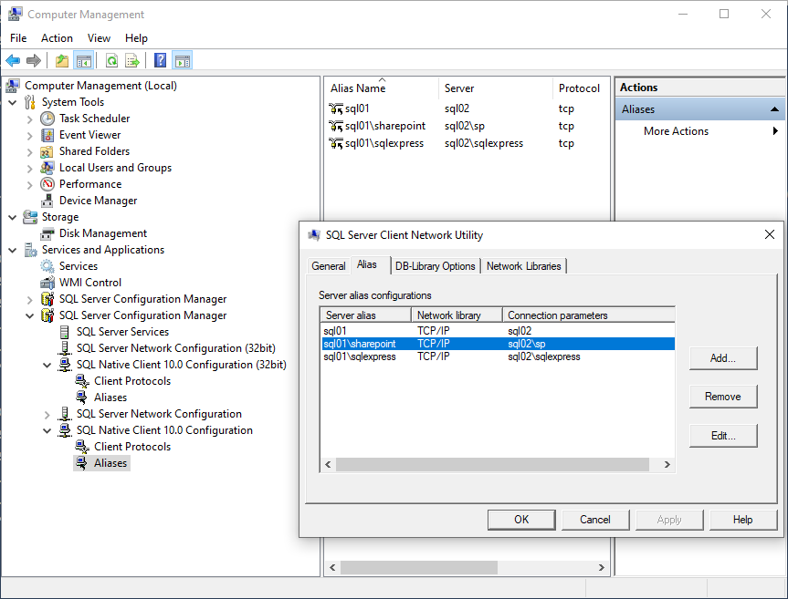 For the longest time, I managed these aliases using cliconfg for 64-bit applications (C:\Windows\System32\cliconfg.exe) or cliconfg for 32-bit applications (C:\Windows\SysWOW64\cliconfg.exe).
