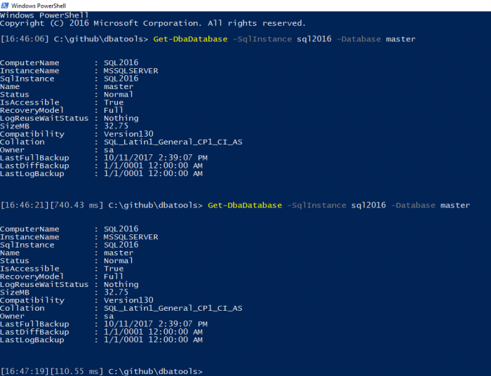 As you can see in the screenshot above, the first time Get-DbaDatabase runs, it takes 740 ms. This is because we’re caching the database names, login names, and some other auto-populated variables in the background.